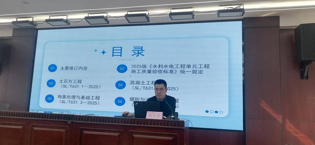 在工作交流会上,2025年科源监理中心通过立项的六个自选课题负责人分别汇报了项目进展情况,分享自己的科研心得和经验。随后,两位同事从修订的背景和目的,主要修订内容和要点解读等多个方面,带领大家一起学习修订后的SL/T223-2025和SL/T631规范规程。最后,夏明庆总经理做总结发言,督促全体科源监理中心职工认真学习新规范。